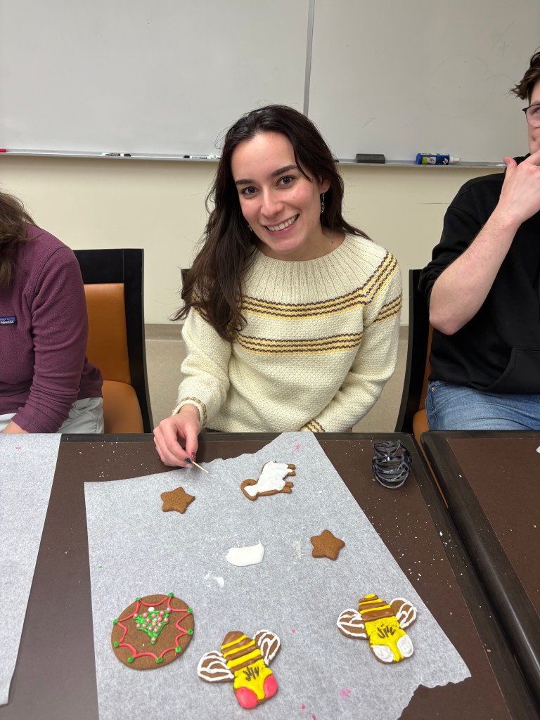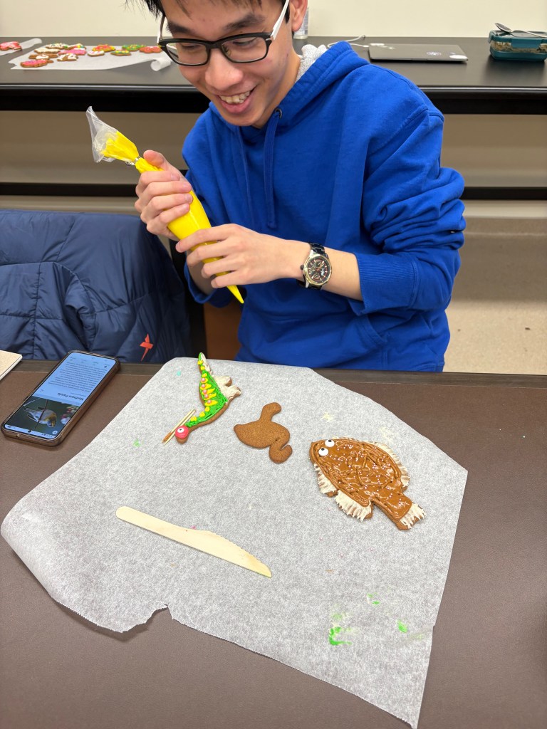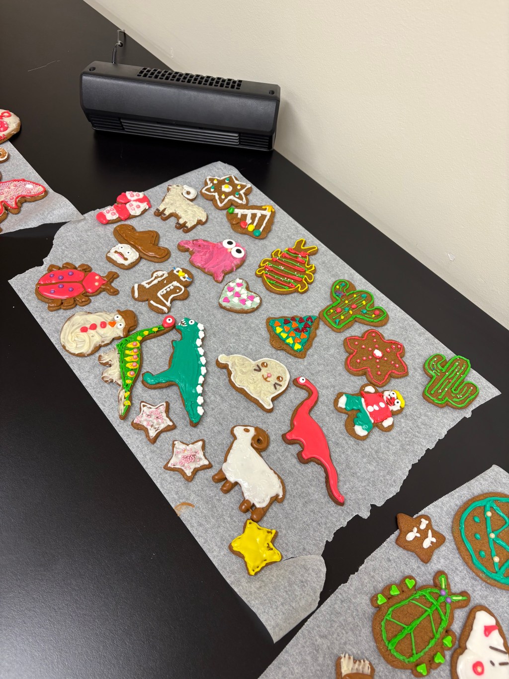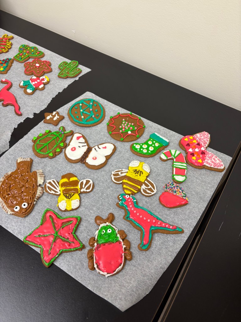 To make the event uniquely us, we designed and 3D-printed custom cookie cutters representing our study species: bighorn sheep, seals, fruit flies, butterflies, mushrooms, trees, and beetles. Using these cutters, we baked batches of gingerbread cookies (recipe available here) and prepared colourful royal icing. Together at the university, we spent an afternoon turning our research species—and a few holiday classics—into edible art.